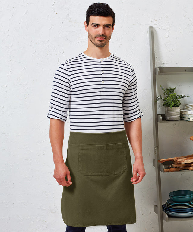 Heavyweight canvas bib apron that can also be folded down to form a half-waist apron. Rounded edges. Gunmetal/antique brass eyelets. Mitred double pocket. Adjustable knotted neckband and matching waist ties that can be fastened to the front or back. Cotton-rich with certified recycled polyester.Sizing to Fit: One size