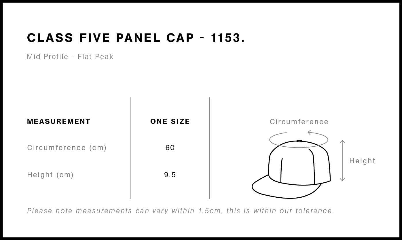 AS Colour Class Five Panel Cap: A lightweight, mid-profile cap constructed from 100% cotton. It features a flat peak, adjustable metal clasp fastener, tonal under-peak lining, and internal mesh structure support for added comfort. Complete with a tear-out AS Colour label for effortless customisation.