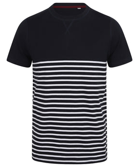 Tag free regular fit, heavyweight short sleeved t-shirt. Crew neck with stretch ribbed neckline. Twin-needle stitching at cuffs and hem. 'V' flatlock stitching detail at neck. Flatlock stitching at neck, shoulder seam and armholes. High chest seam. Striped lower body; contrast plain upper body and sleeves. Coordinates with FR134 long sleeved Breton T.Product Features