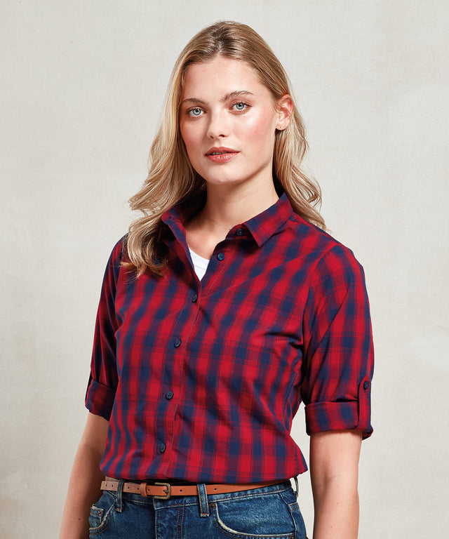 A women's long sleeve semi-fitted shirt with multi-coloured contrast check pattern. Single button cuff and sleeve guard which is designed to be rolled up and secured in place with a button and tab on the upper arm. Soft collar styling with curved hem.Product Features