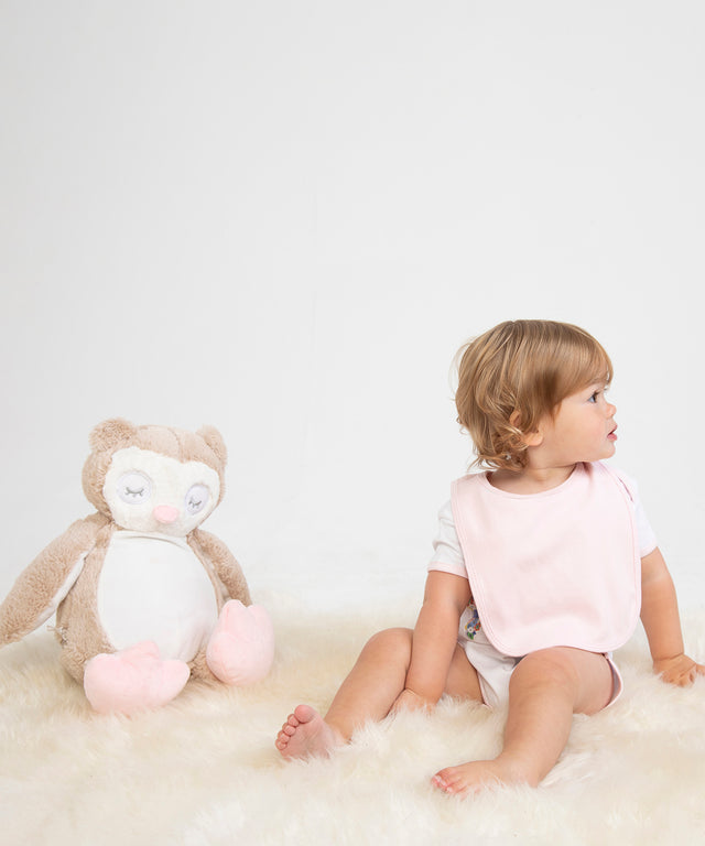 Light Brown coloured soft plush owl. Contrast pink nose and feet. Cream coloured panel on chest and under wings. Zip details on the base of the owl for direct access onto the tummy for embroidery. Removable inner stuffing. Complies with EN71 European Toy Safety regulations. Remove all hang tags and their fasteners before giving these items to a child. Suitable for children of all ages.