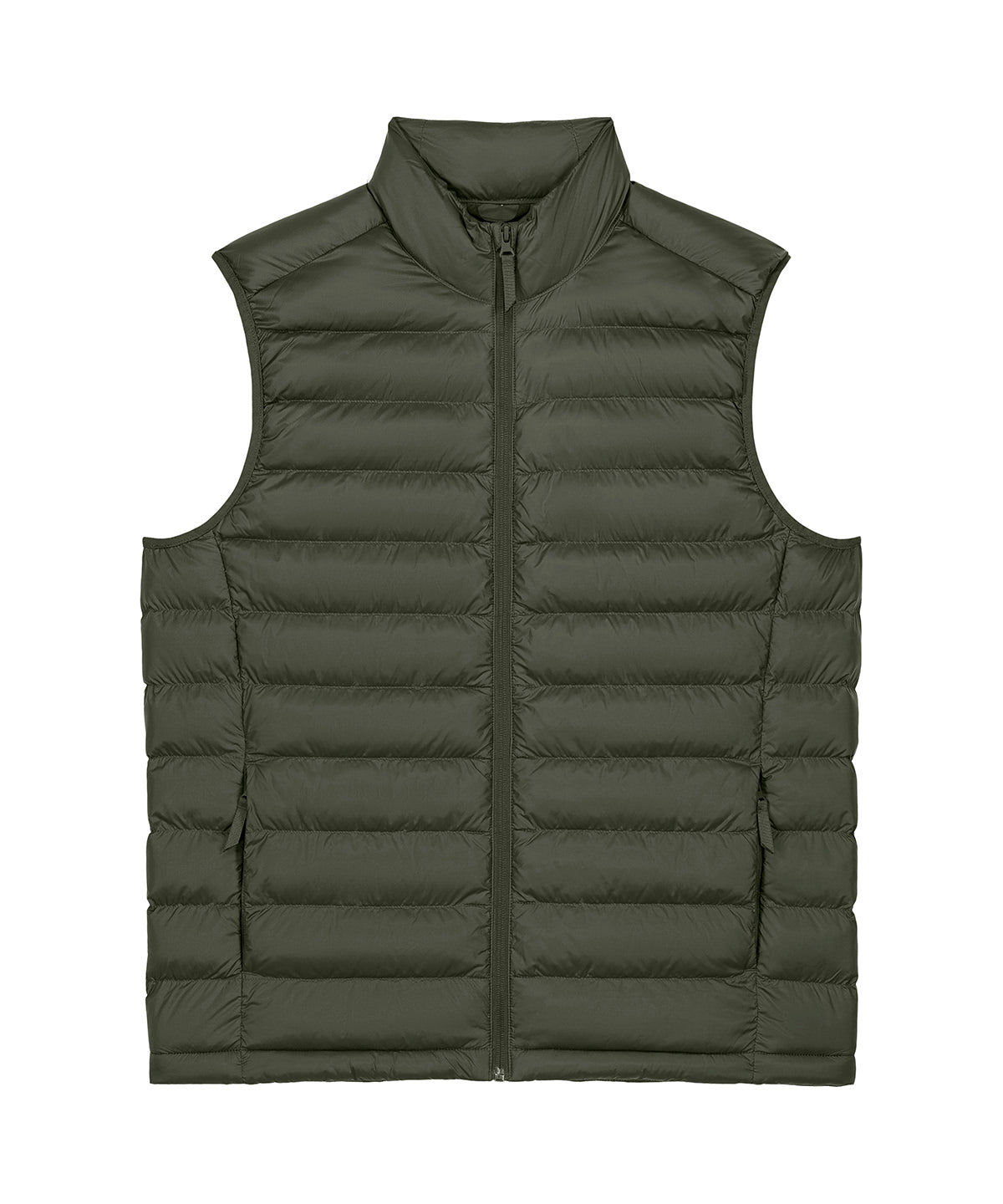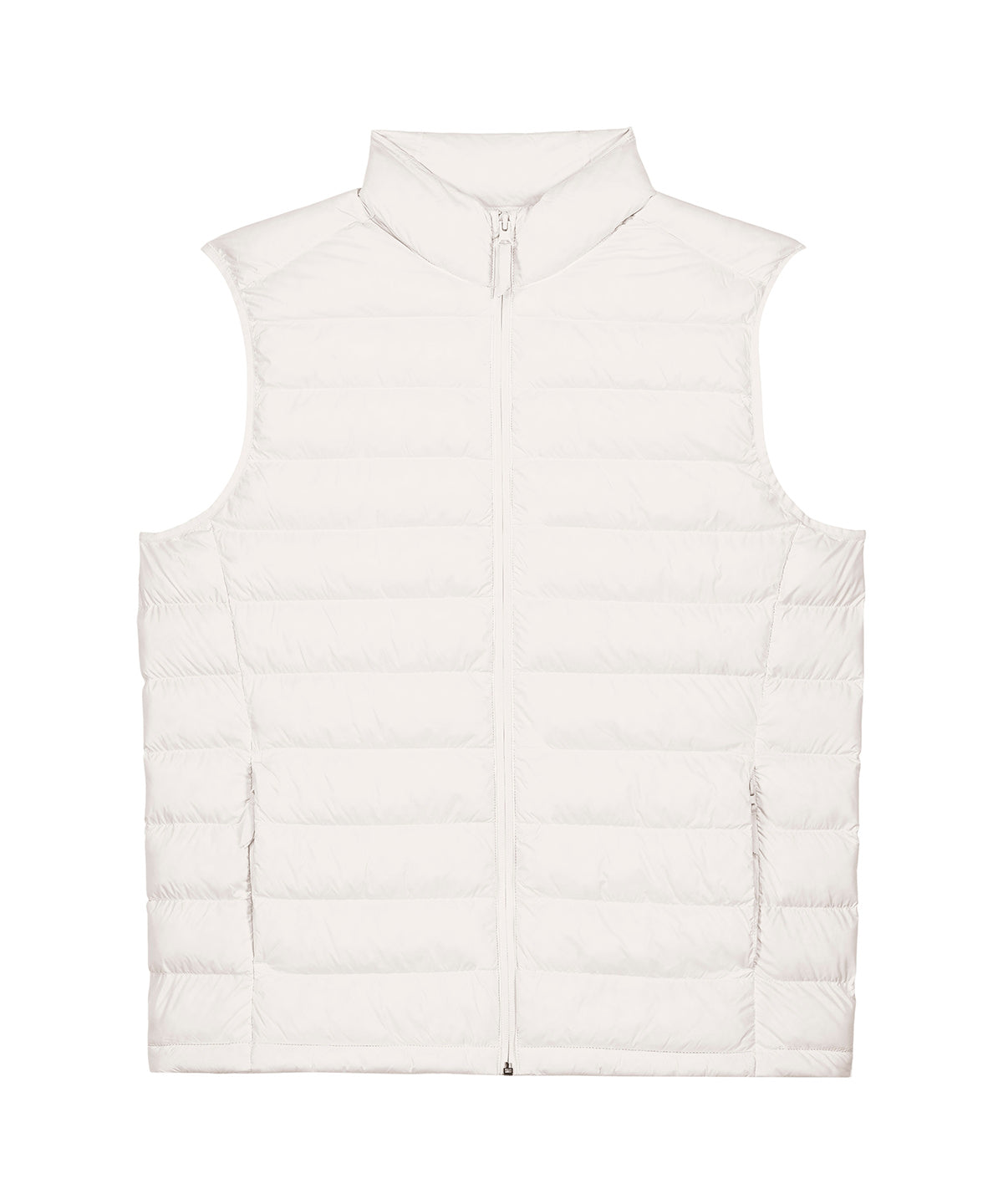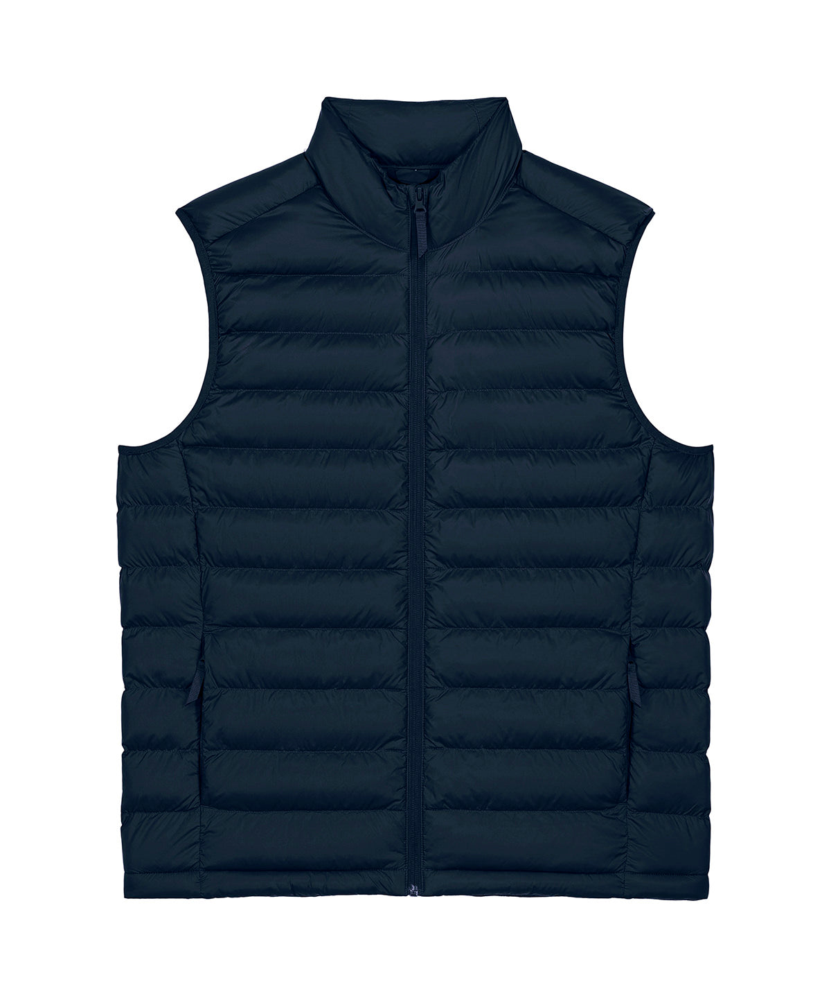 Men’s bodywarmer. Medium fit. Sleeveless. High collar. Reverse nylon zip at centre front. Zipped welt pockets with extra grosgrain puller. Elastic tape binding at the armhole. Fully quilted. Side panels for a better shape. Inside seams with binding finish. Bottom hem has an adjustable plastic stopper and elastic cord.