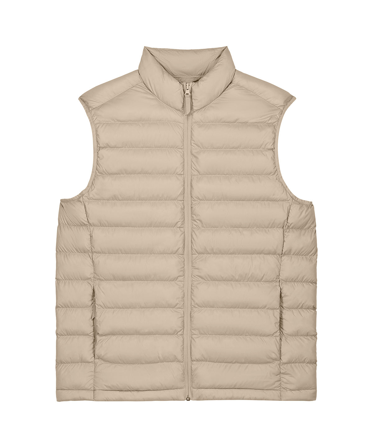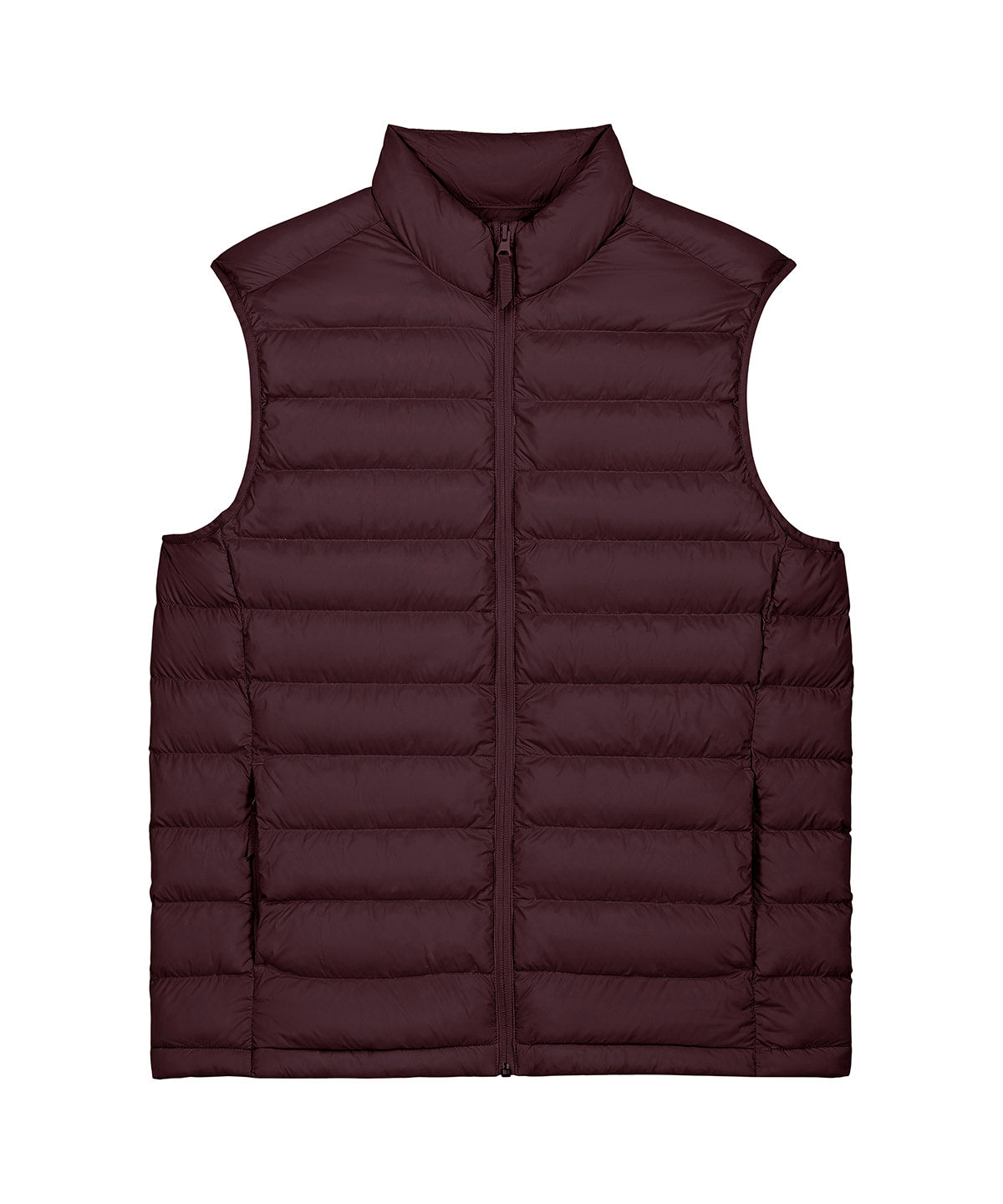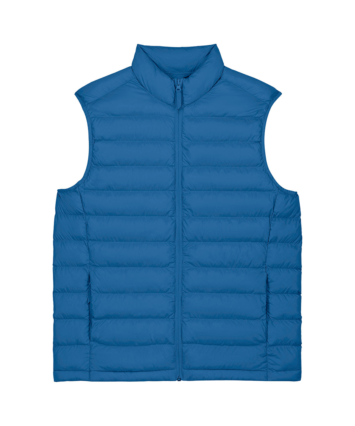 Men’s bodywarmer. Medium fit. Sleeveless. High collar. Reverse nylon zip at centre front. Zipped welt pockets with extra grosgrain puller. Elastic tape binding at the armhole. Fully quilted. Side panels for a better shape. Inside seams with binding finish. Bottom hem has an adjustable plastic stopper and elastic cord.